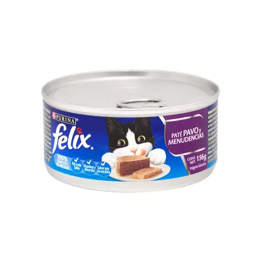 Vísceras de cerdo, agua suficiente para proceso, carne de pavo, vísceras de pollo y/o pavo, carne de pescado, menudencias de pollo y/o pavo, arroz, sal, goma guar, fosfato de calcio, colorante (dióxido de titanio), cloruro de potasio, carragenina, sulfato de magnesio, taurina, cloruro de colina, mononitrato de tiamina, suplemento de vitamina E, sulfato de zinc, sulfato ferroso, niacina, pantotenato de calcio, sulfato de cobre, suplemento de vitamina A, sulfato de manganeso, complejo sódico de bisulfito de menadiona (fuente de actividad de vitamina K), hidrocloruro de piridoxina, suplemento de riboflavina, suplemento de vitamina B-12, biotina, ácido fólico, suplemento de vitamina D-3, yoduro de potasio.